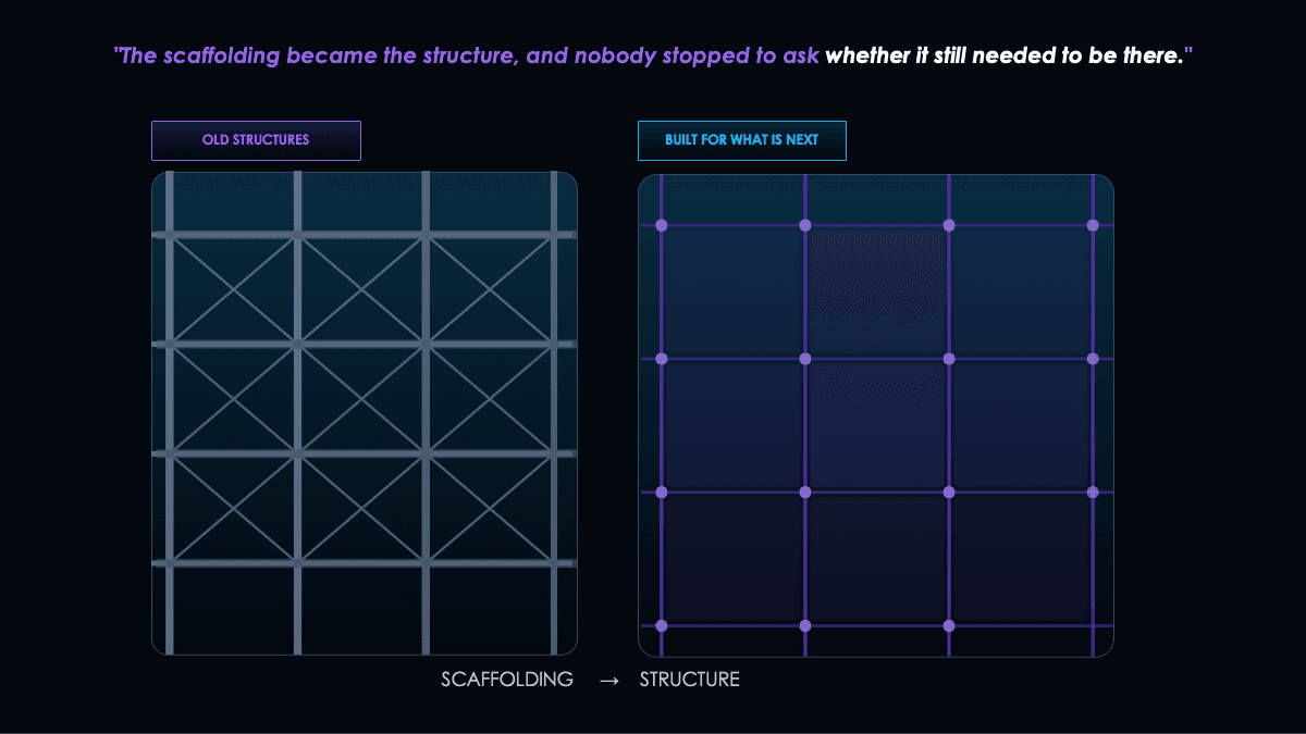 That wasn't a failure of imagination — it was an honest reckoning with what the technology could do at the time. The problem is that the scaffolding became the structure, and nobody stopped to ask whether it still needed to be there. No one looked at the accumulated weight of those decisions and asked: "What if?"